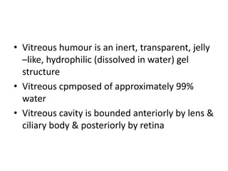 The vitreous is a clear jelly-like structure that fills the vitreous cavity between the lens and retina. It is composed primarily of water along with collagen fibrils and hyaluronic acid which give it structure and elasticity. The vitreous develops in three stages - primary, secondary, and tertiary vitreous. It has three main regions - the hyaloid layer, cortical vitreous, and medullary vitreous. The vitreous provides optical clarity and acts as a scaffold that helps maintain the shape of the eyeball.