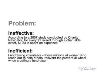 The document outlines the Viva approach for effectively planning charity events, addressing the common issues of inefficiency and high expenses. It presents a structured 4-step method that includes setting goals, creating a detailed plan, managing budgets, and analyzing outcomes post-event. Resources and best practices for fundraising and event organization are also provided to enhance the overall fundraising efforts.