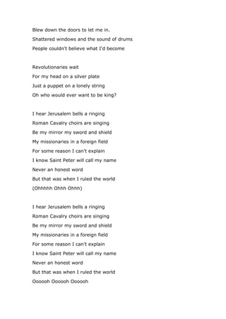 The song describes a former ruler who has lost his power and kingdom. He reflects on how he used to command the seas and strike fear into his enemies. Now he sweeps the streets that he once owned. He hears church bells ringing and choirs singing, but knows that his time ruling the world has passed.