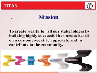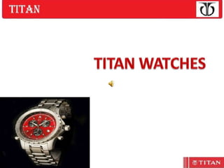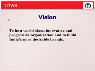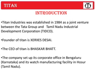 Titan Industries was established in 1984 as a joint venture between Tata Group and TIDCO. It is the largest watch company in India and fifth largest in the world, manufacturing over 100 million watches across 30 countries. Titan's CEO is Bhaskar Bhatt and it was founded by Xerxes Desai. The company segments its brands according to lifestyle, socioeconomic group, and personality. Some of its main brands are Titan, Fastrack, Sonata, and Tanishq jewelry. Titan has seen strong financial growth in recent years with 57.5% sales growth last quarter and projected sales of $1 billion next fiscal year.