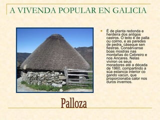 A VIVENDA POPULAREN GALICIA É de planta redonda e herdeira dos antigos castros. O teito é de palla ou colmo, e as paredes de pedra, cáseque sen fiestras. Consérvanse boas mostras nas montañas do Cebreiro e nos Ancares. Nelas viviron os seus moradores até a década de 1960, compartindo a súa estancia interior co gando vacún, que proporcionaba calor nos duros invernos. Palloza