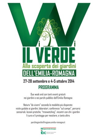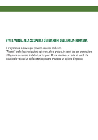 Il documento descrive eventi gratuiti dedicati ai giardini e alla natura dell'Emilia-Romagna, in programma il 27-28 settembre e il 4-5 ottobre 2014, con attività come visite guidate, laboratori e conferenze. Ogni evento è organizzato in diverse province e prevede partecipazione libera, anche se alcune attività possono necessitare di prenotazione. Il programma include eventi specifici per famiglie e bambini, facilitando la scoperta e l'apprezzamento del patrimonio verde regionale.