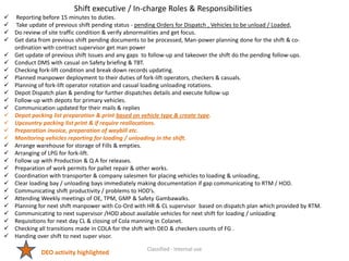 The document contains an organizational chart for the Vizag Shipping team and outlines responsibilities for shift executives/in-charges, data entry executives, and the MIS executive. Key roles include overseeing loading/unloading operations, documentation preparation, manpower planning, safety compliance, and inventory management/reporting.
