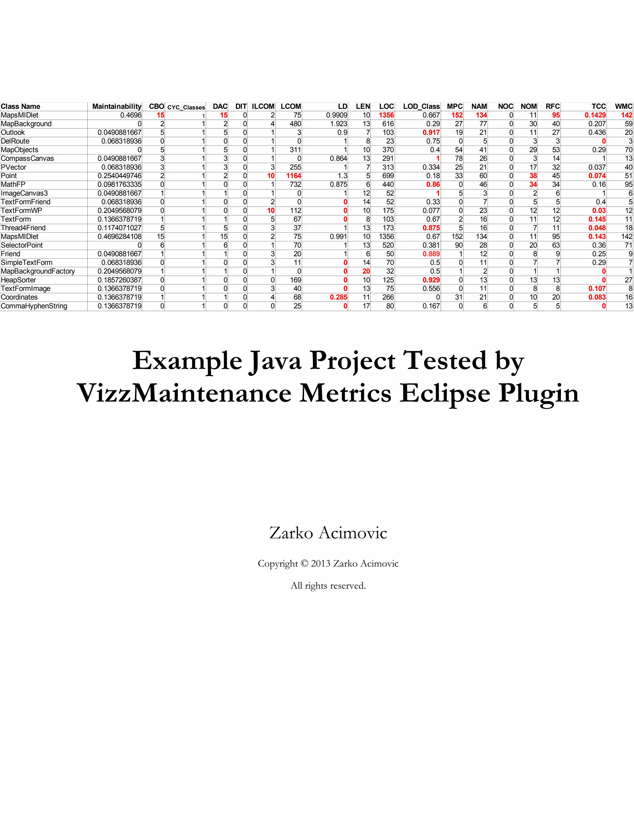 This document presents the results of analyzing a 5,000 line Java project with the VizzMaintenance metrics tool. The project was developed over 3 months by a single developer without formal defect prevention methods. Each class is preceded by its metrics report from VizzMaintenance and a comment on potential design issues based on the metrics. Several classes are highlighted as having low Locality of Data or Tight Class Cohesion metrics, indicating errors in abstraction or design. The CommaHyphenString class is discussed in more detail as an example, with explanations of how its LD and TCC metrics relate to potential problems in testability and maintainability.