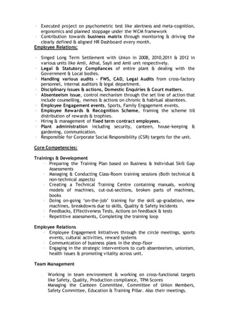 Tanmay Pandit is an HR professional with 9 years of experience in FMCG companies like Hindustan Unilever Limited and Asian Paints. He currently works as a Senior Executive of HR at HUL in Silvassa, earning an annual CTC of Rs. 11.05 lacs. In his role, he handles responsibilities like recruitment, training, employee relations, and compliance. Some of his achievements include harmonizing employee wages and grades, implementing a new career path, and winning multiple awards for best HR and TPM practices.