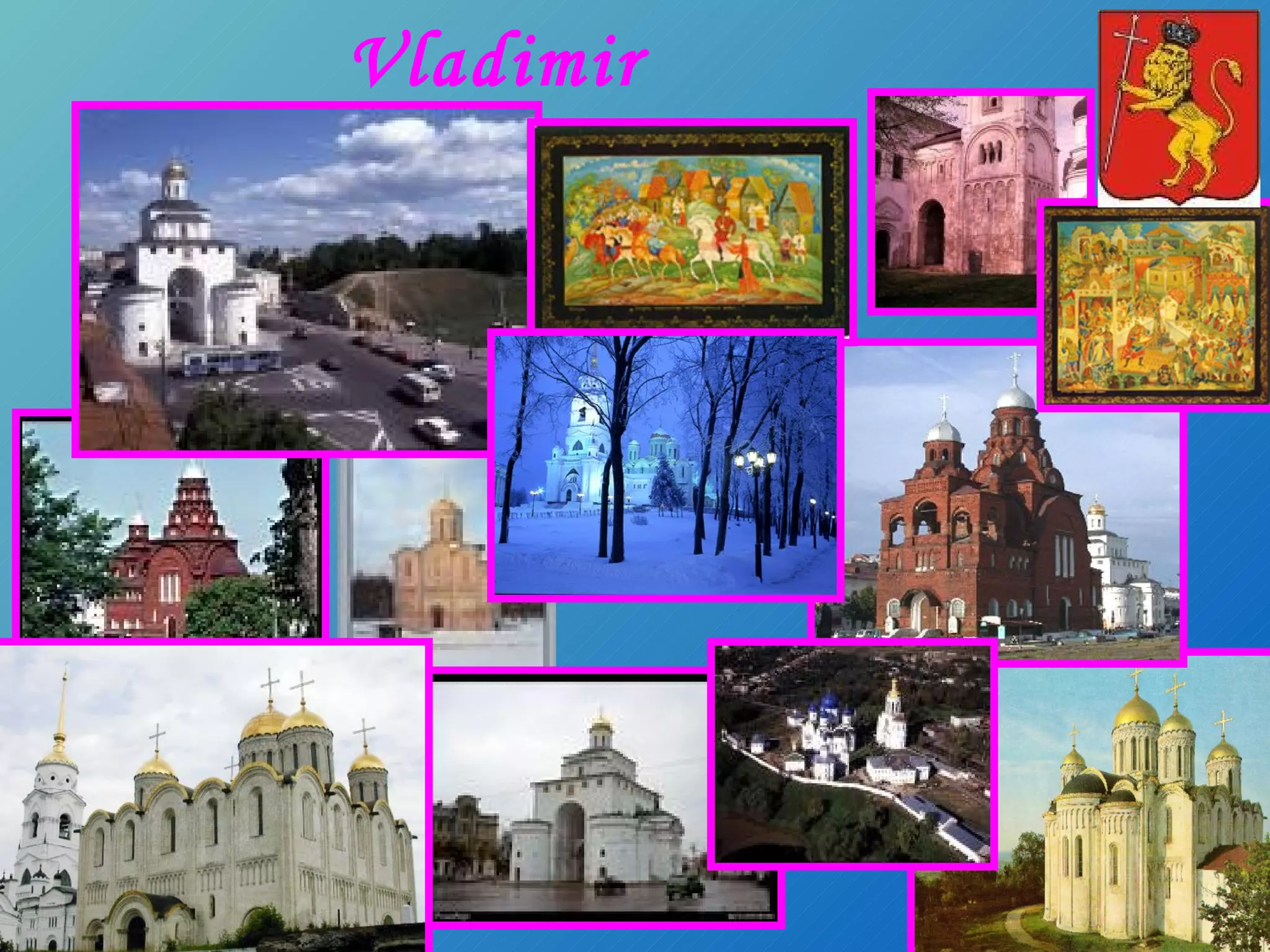 Vladimir is a historic city in western Russia founded in 990 AD. It has a population of 340,000 and was formerly the capital of Rus in the 12th-14th centuries. Some of its most notable landmarks include the Golden Gate built in 1158-1164 as the main entrance to the city, and the Cathedral of the Assumption, a five-domed Orthodox church constructed in 1158-1160 that served as the main church of the region. Both landmarks are now part of the Vladimir and Suzdal museum and are UNESCO World Heritage sites.