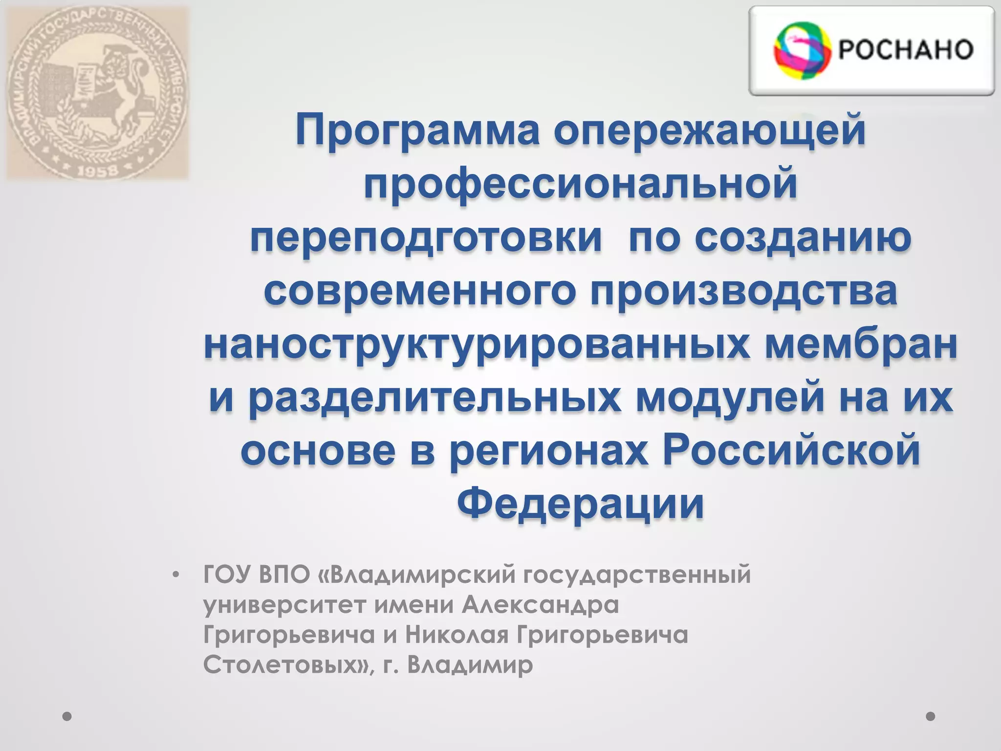 В документе представлена программа профессиональной переподготовки по производству наноструктурированных мембран и разделительных модулей в Российской Федерации, направленная на формирование необходимых компетенций у работников. Программа охватывает различные дисциплины, включая коллоидную химию, мембранные технологии и менеджмент качества, и предполагает как теоретическое, так и практическое обучение. Целью программы является удовлетворение кадровых потребностей наноиндустрии и развитие новых рынков труда.
