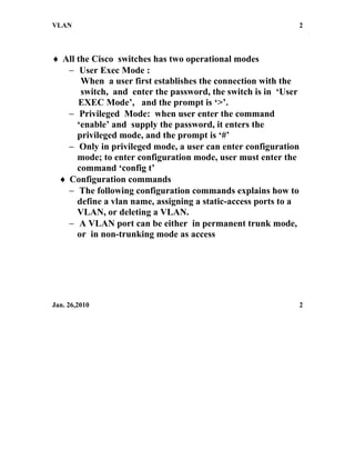 The network lab contains two Catalyst 2950T24 switches named Maryland and California, and one Catalyst 2950G switch named Virginia. The 2950T24 switches each have 24 10/100 Base T ports and two 10/100/1000 Base T ports. The 2950G switch currently does not have its two 10/100/1000 Base T ports installed. VLANs are used to segment the network and define which ports belong to which VLANs through configuration commands.