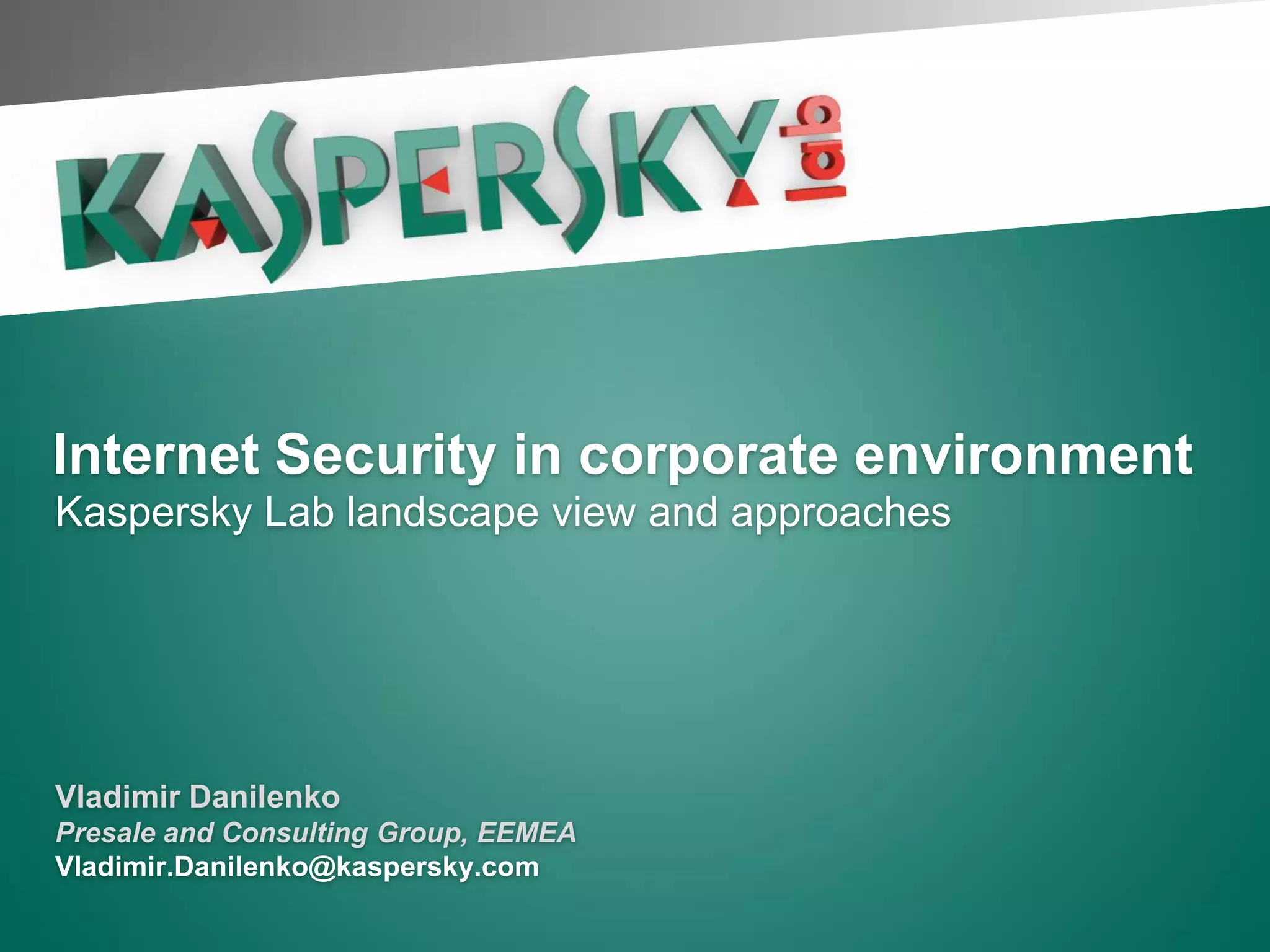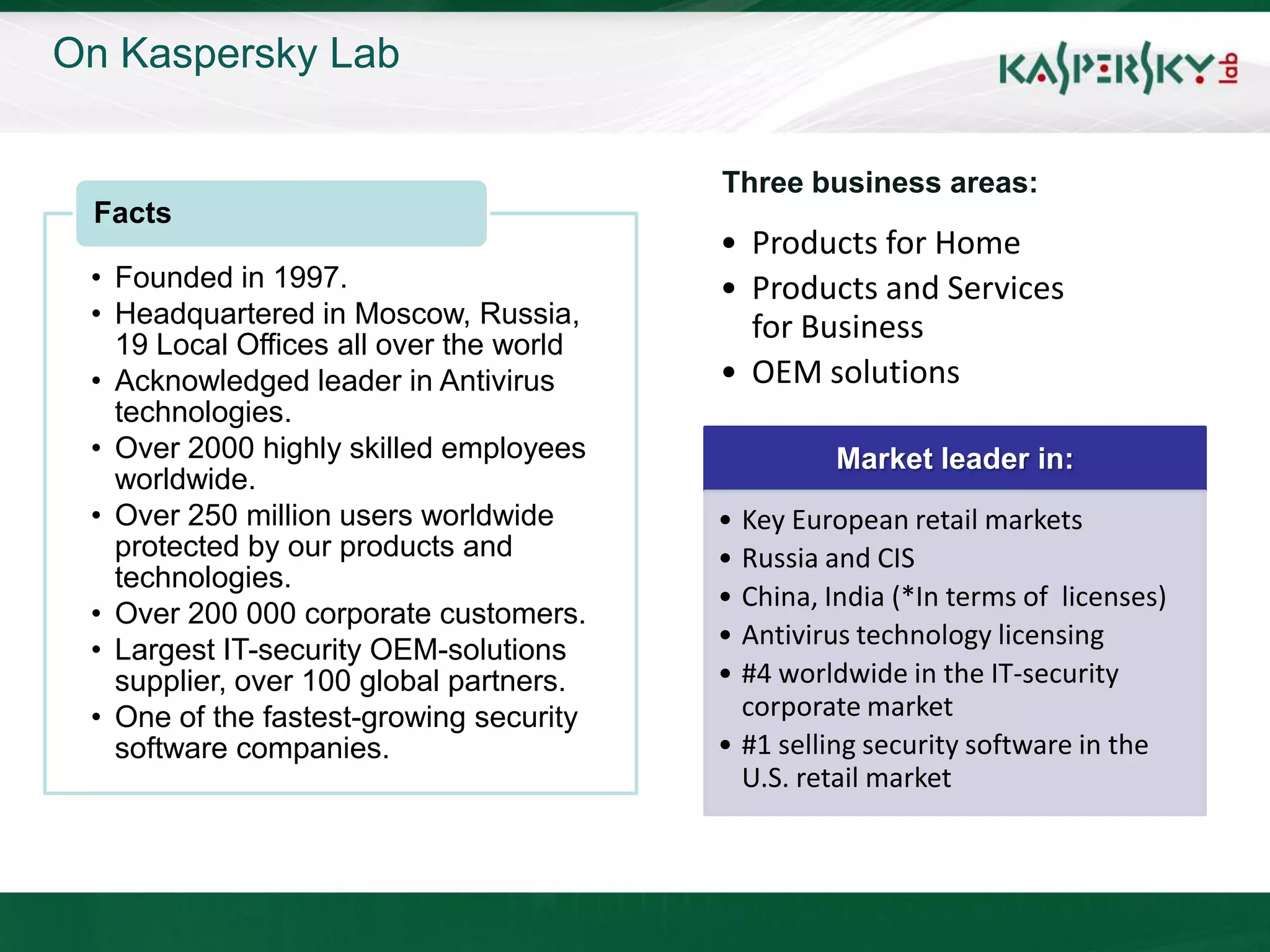Kaspersky Lab, established in 1997 and headquartered in Moscow, is a leading player in the corporate antivirus and IT security market, boasting over 250 million users and more than 200,000 corporate clients worldwide. The document outlines Kaspersky's various products and services aimed at protecting businesses from rapidly increasing malware threats, highlighting recent updates with improvements in antivirus, firewall, and device management capabilities. It emphasizes the importance of robust antivirus protection as new malware continues to emerge at an alarming rate.