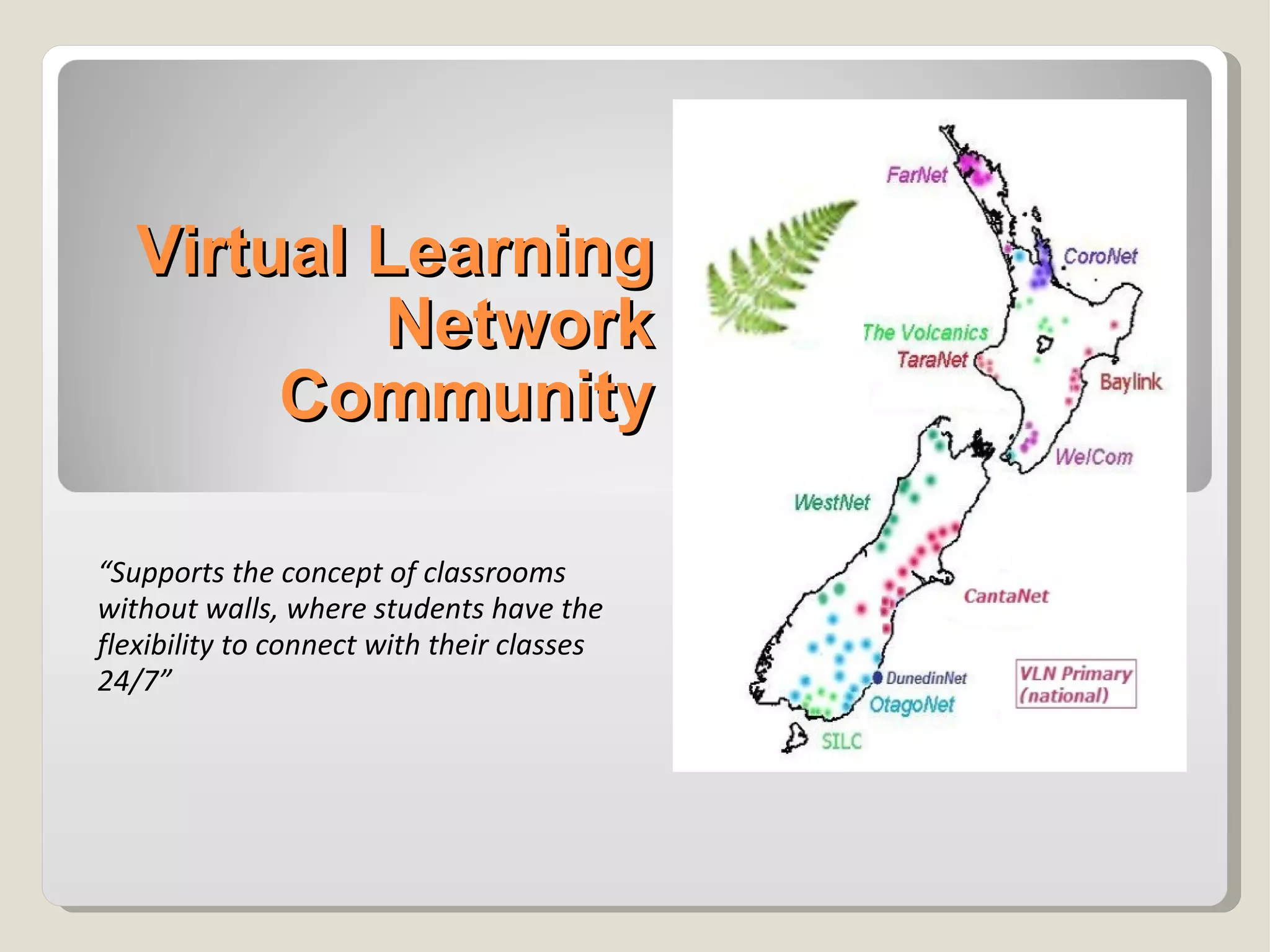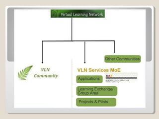 The Virtual Learning Network (VLN) Community supports flexible, online classrooms without walls. It began in the early 1990s and has grown to include over 250 schools. VLN allows students to connect with classes 24/7 through video conferencing, online collaboration tools, and asynchronous learning resources. Benefits of VLN include maximizing teaching resources, offering more curriculum choices, and providing greater flexibility and access to experts for students.