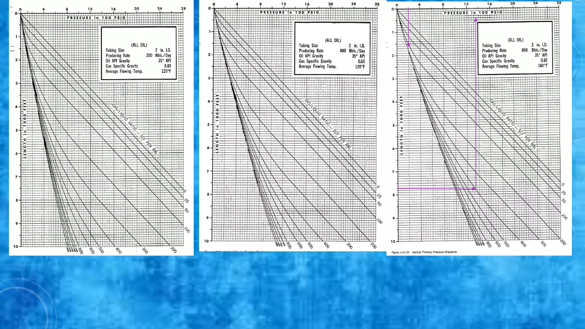 This document discusses vertical lift relationships and working charts used to determine production parameters like PWF given other known values. It provides an example of using a working chart for a 1.5" tubing to calculate a PWF of 1600 psi given a PTH of 200 psi, flow rate of 500 bbl/day, well depth of 5000 ft, and GLR of 200 scf/bbl. It also demonstrates using vertical flow performance curves and an IPR curve to determine an allowable flow rate of 820 bbl/day at a PWF of 1450 psi.