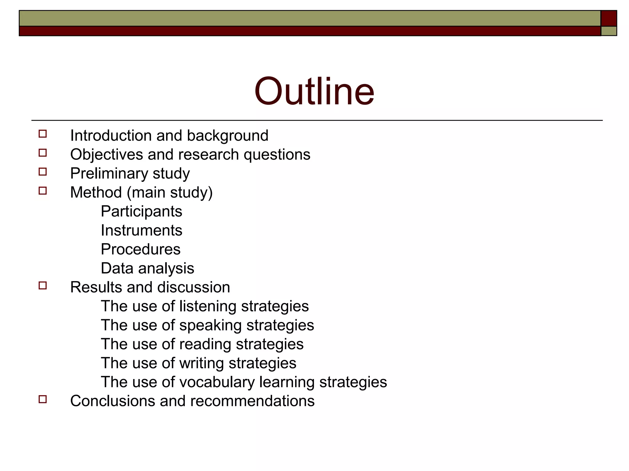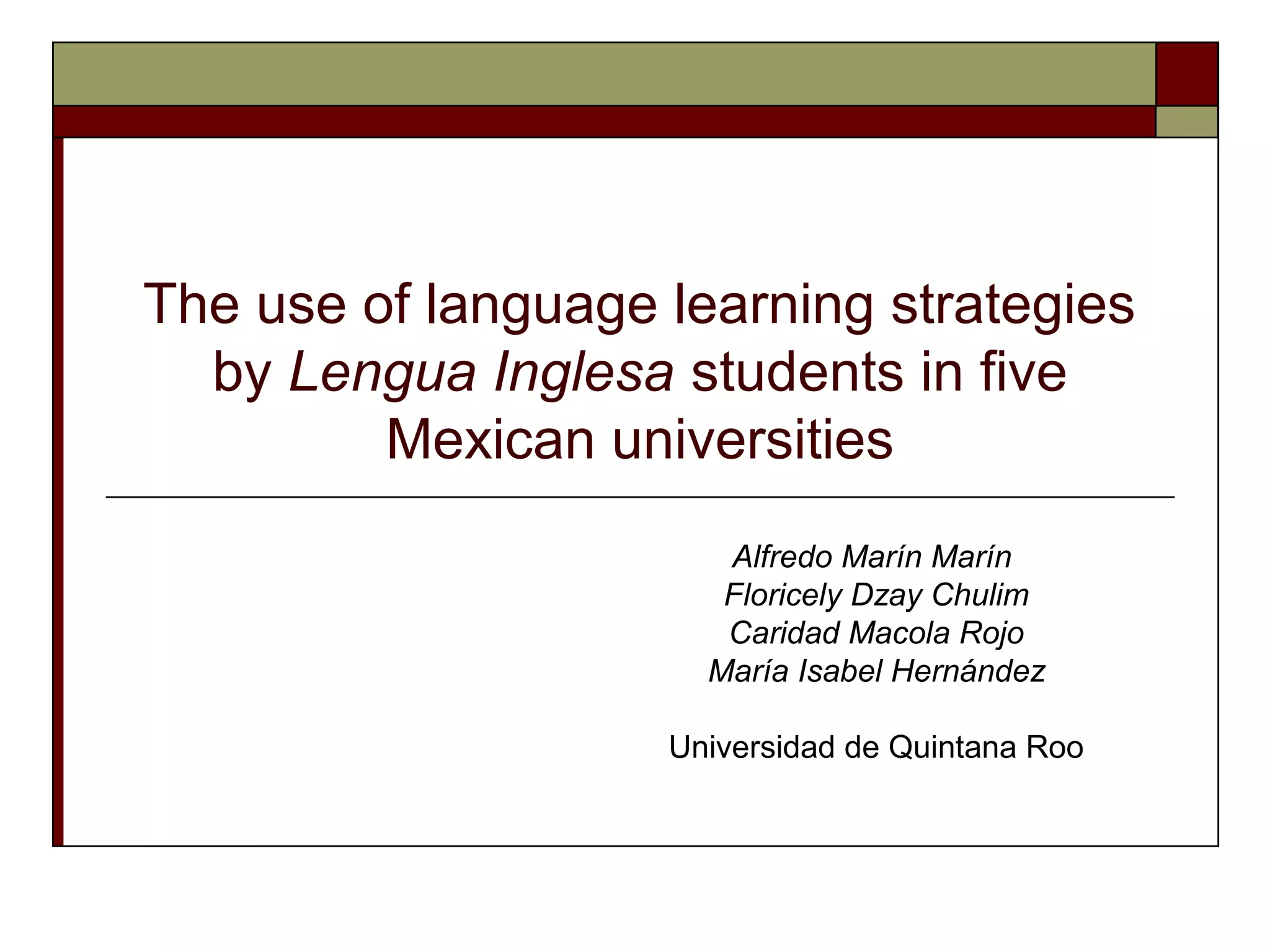 This study investigated the use of language learning strategies among English majors at five Mexican universities. It found that writing strategies were the most frequently used and reading strategies the least. Vocabulary learning strategies and writing strategies use varied based on university, English level, gender, and whether students received strategy training. The study provided insights into strategy use that can help improve language instruction.