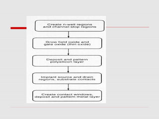 2. Active device regions and field oxide isolation are then patterned, followed by gate oxide growth and polysilicon deposition.
