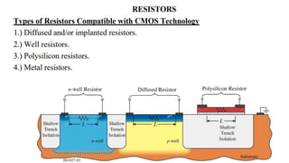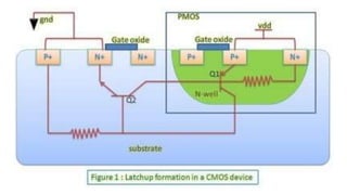 This document provides information on CMOS technology and embedded systems. It discusses latch-up, which refers to a short circuit formed between power and ground rails that can damage an IC. It is caused by parasitic bipolar transistors forming a SCR structure. Methods to prevent latch-up include adding resistance to limit current, surrounding transistors with oxide to break the SCR structure, and latchup protection circuitry. The document also covers layout design rules, physical design, CMOS logic gates like inverters, NAND and NOR gates, and MOS transistor operation.