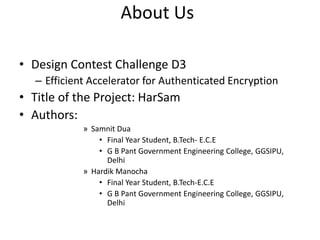 The document presents a project titled Harsam, a hardware implementation of the Tiaoxin-346 design, which focuses on efficient authenticated encryption to enhance data security. Authenticated encryption is introduced as a more reliable method than traditional encryption by requiring both encryption and authentication in a single process. The project details the stages of encryption and decryption processes, alongside simulation results, and outlines future work to improve design performance.