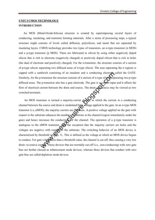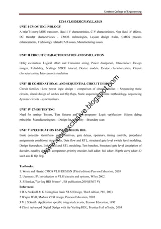 This document outlines the syllabus for a VLSI design course. The syllabus covers five units: (1) CMOS technology, including history, characteristics, and enhancements; (2) circuit characterization and simulation; (3) combinational and sequential circuit design; (4) CMOS testing; and (5) specification using Verilog HDL. The first unit provides an introduction to CMOS technology, discussing MOS transistors, CMOS processes like p-well and n-well, and layout design rules. Subsequent units cover circuit analysis, common circuit elements, testing approaches, and hardware description languages. References include textbooks on VLSI design, digital circuits, and Verilog HDL.