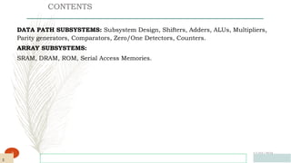 The document focuses on subsystem design in VLSI, covering various data path subsystems such as shifters, adders, and multipliers. It outlines different types of adders and their structures, array multipliers, and memory classifications including SRAM, DRAM, and ROM. Additionally, it discusses counters, linear-feedback shift registers, and the operational principles of different types of memory systems.