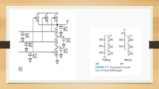 The document discusses propagation delay, rise/fall times, and transient response in digital circuits. It defines key timing parameters and describes how to model digital gates and wires as resistor-capacitor circuits to estimate delays. The RC model approximates transistor behavior with average resistance and capacitance values. Delay is calculated using techniques like Elmore delay, which sums the resistive and capacitive contributions of each node in the circuit. Examples show how to apply these techniques to calculate delays for common circuit structures.