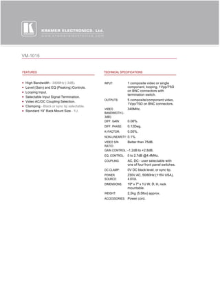 The VM-1015 is a 1U rack mountable distribution amplifier that takes a single composite or SDI video input signal and distributes it to 5 outputs. It provides controls for level, equalization, input termination, video coupling, and clamping to compensate for signal losses over long cable runs. It has a bandwidth of 340MHz and technical specifications that maintain high quality video distribution.