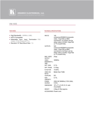 The VM-1055 is a 1U rack mountable 5-output distribution amplifier for RGBHV video signals. It provides isolation and buffering to distribute an input signal to five identical outputs with high bandwidth of 300MHz and compatibility with HDTV. It has selectable sync input termination and technical specifications including less than 0.1% differential gain, phase, and nonlinearity.