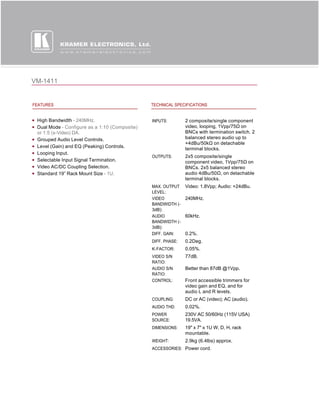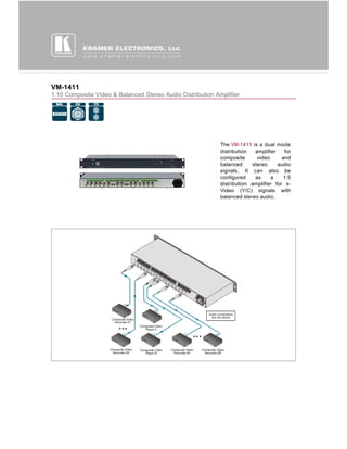 The VM-1411 is a 1U rack mountable distribution amplifier that can be configured as either a 1:10 composite video and stereo audio distribution amplifier, or as a 1:5 S-video and stereo audio distribution amplifier. It has high bandwidth up to 240MHz for video and 60kHz for audio, as well as front panel controls for video gain, equalization, and individual audio channel levels. It is designed to distribute composite or S-video signals along with balanced stereo audio signals to multiple displays.