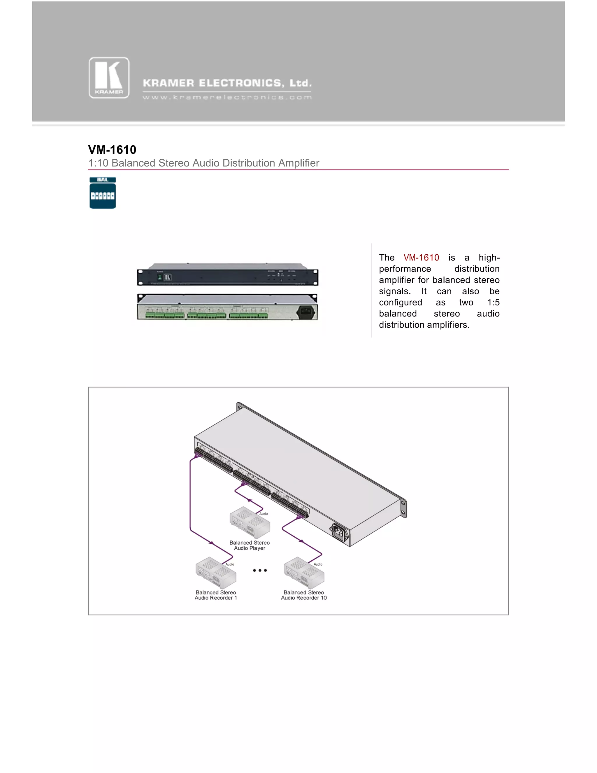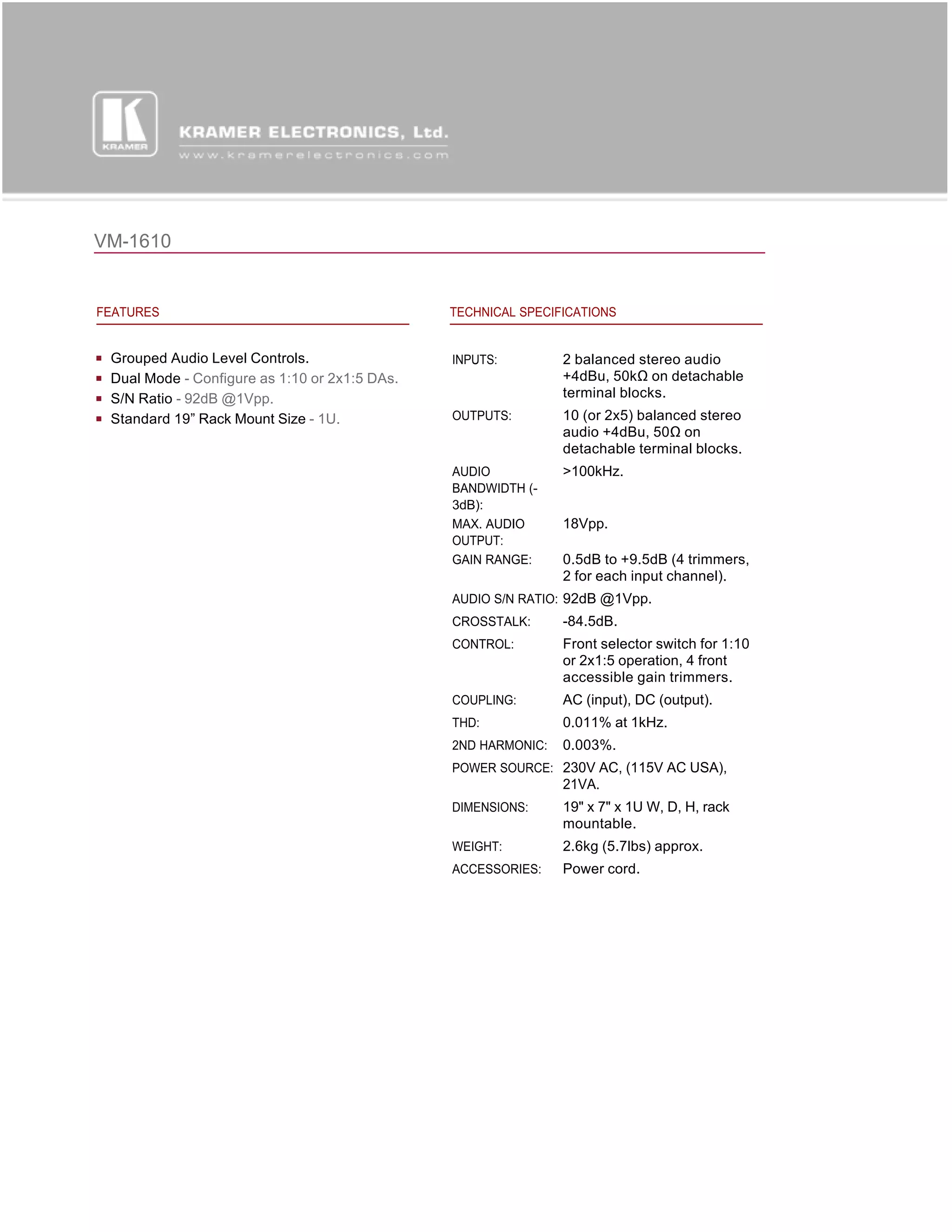 The VM-1610 is a 1U rack-mounted audio distribution amplifier that can distribute a balanced stereo input signal to either 10 balanced stereo outputs (configured as 1:10) or to 2 groups of 5 balanced stereo outputs each (configured as 2 x 1:5). It has detachable terminal block inputs and outputs, front-accessible gain trimmers, and a signal-to-noise ratio of 92dB. The unit is powered by 230V AC or 115V AC and has dimensions of 19" x 7" x 1U.