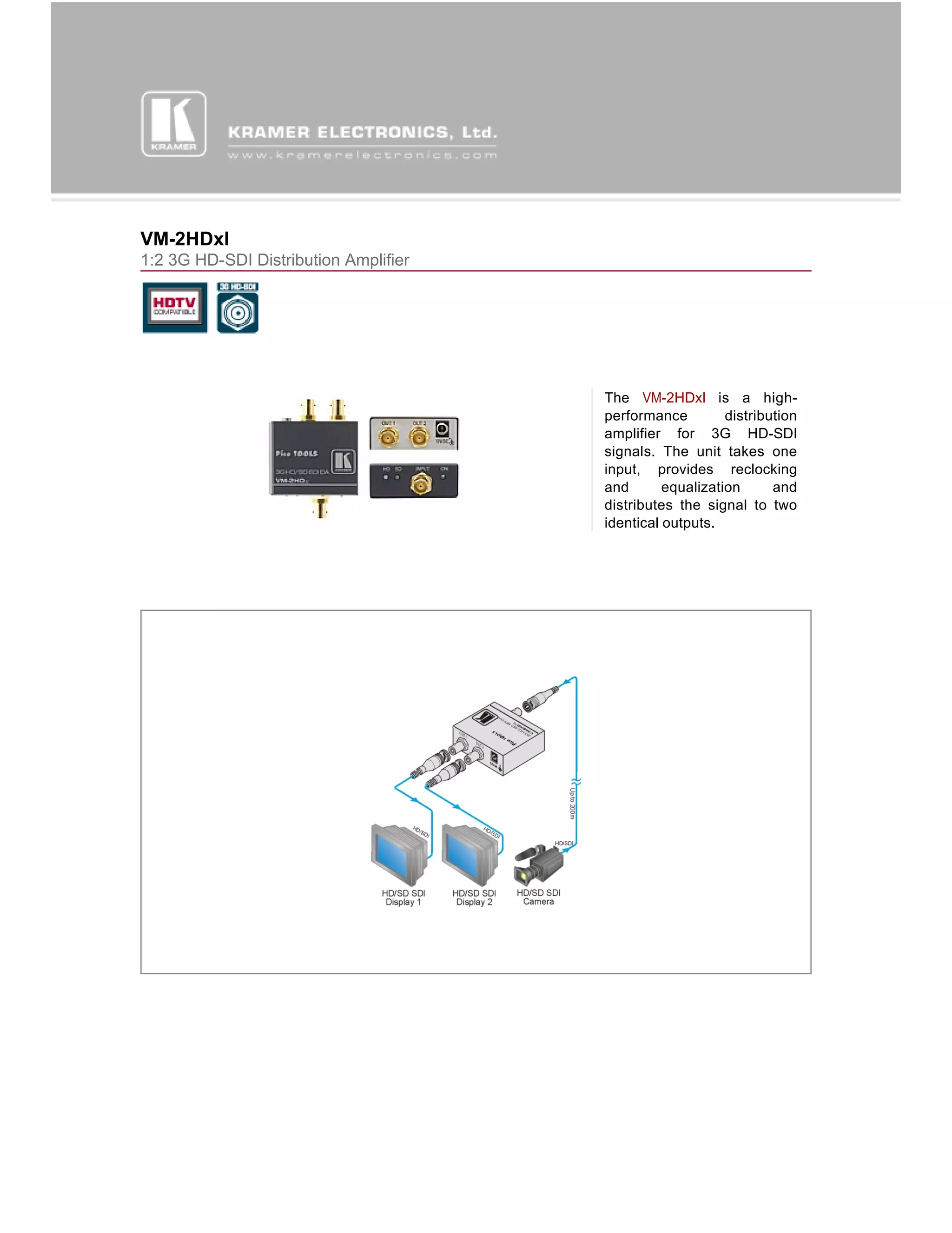 The VM-2HDxl is a high performance 3G HD-SDI distribution amplifier that takes one 3Gbps HD-SDI or SDI input signal and provides two identical, reclocked and equalized outputs. It supports SDI, HD-SDI and 3G HD-SDI standards and can distribute signals up to 2.97Gbps over longer distances using Kramer's equalization and re-clocking technology. The compact unit can be rack mounted in a 1U space using an optional rack adapter.