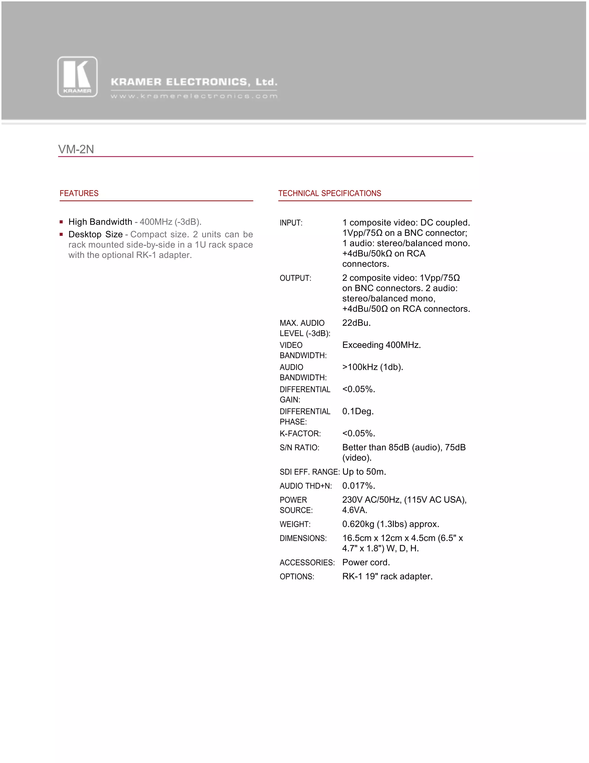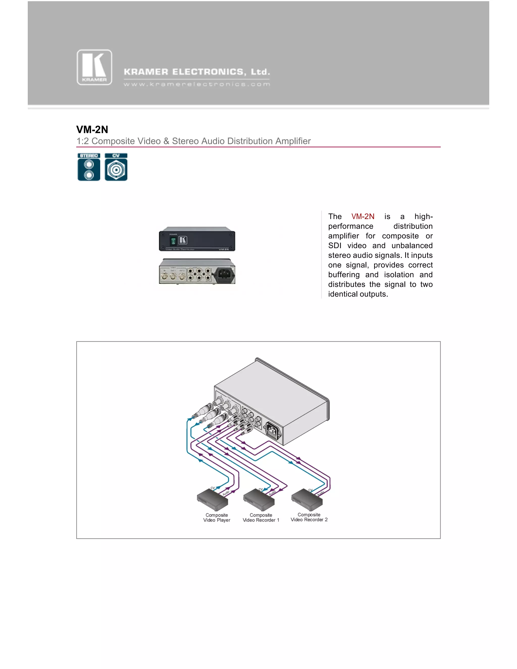 The VM-2N is a compact distribution amplifier that takes a single composite video and stereo audio signal as input and distributes it to two identical outputs while maintaining high bandwidth and low distortion. It can be rack mounted and features a bandwidth of 400MHz for video and over 100kHz for audio, with differential gain and phase of less than 0.05% and 0.1 degrees respectively. Power requirements are 230V AC/50Hz or 115V AC.