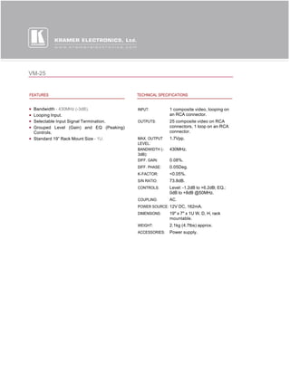 The VM-25 is a 1U rack mountable distribution amplifier that takes one composite video input signal and distributes it to 25 identical outputs while maintaining high bandwidth of 430MHz and low distortion. It provides looped input and output connections as well as controls for level and equalization. The unit is powered by a 12V DC power supply and measures 19" x 7" x 1U.