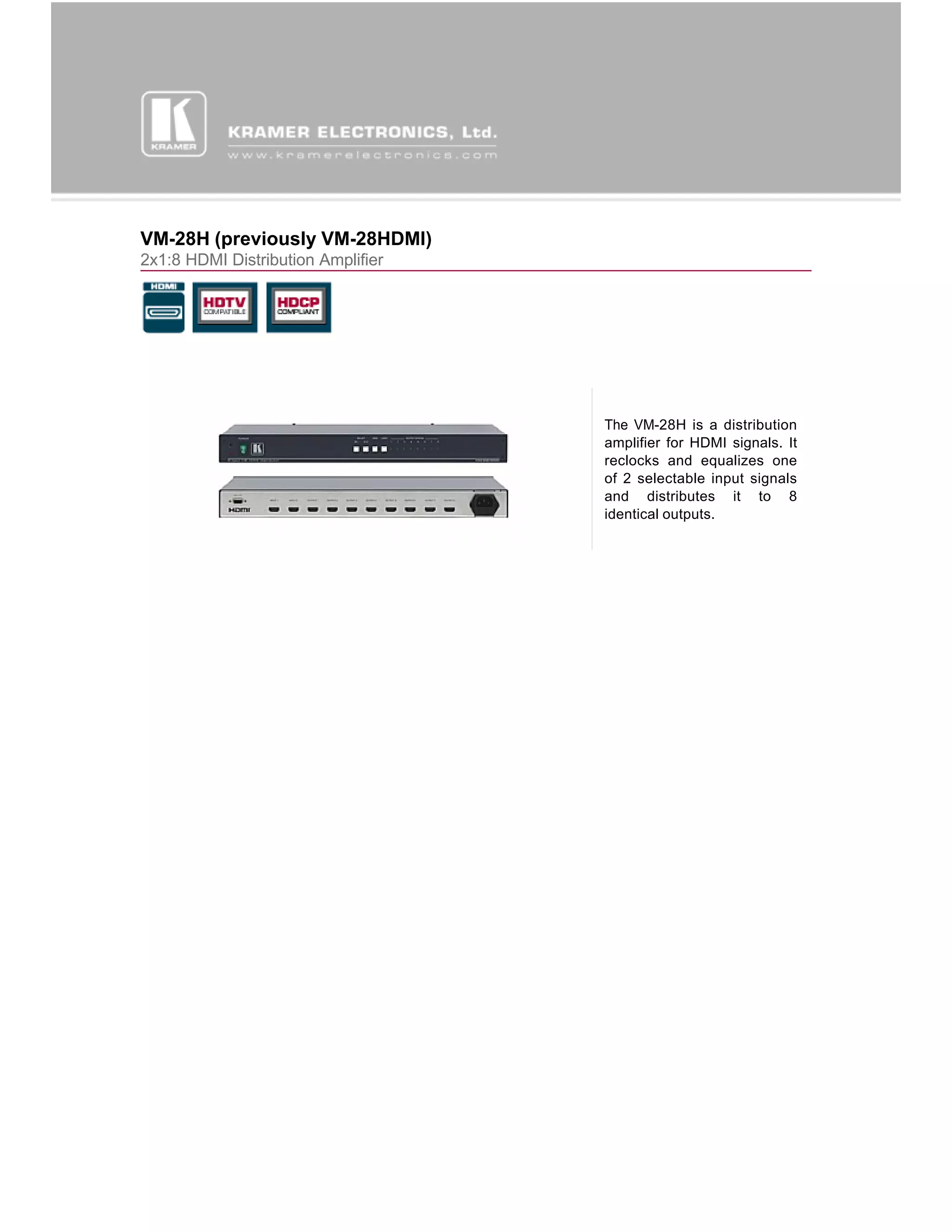 The VM-28H is a distribution amplifier that takes a single HDMI input signal, reclocks and equalizes it, and distributes it to 8 identical HDMI outputs. It supports HDMI bandwidth up to 2.25Gbps and features such as 3D pass-through, HDCP compliance, EDID processing, and Kramer equalization and re-clocking technology to rebuild and reclock the signal for longer cable runs. It can be controlled via front panel buttons, IR remote, or RS-232 and includes power supply, rack ears, and output status LEDs.