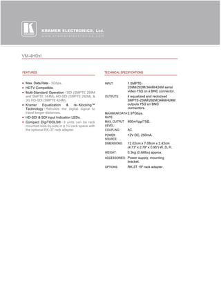 The VM-4HDxl is a video distribution amplifier that takes one 3Gbps HD-SDI or SDI video input signal and distributes an equalized and reclocked version of that signal to four identical outputs. It uses Kramer's equalization and reclocking technology to rebuild the digital signal for longer cable runs. The unit is compact and can be rack mounted in a 1U space with an optional rack adapter.
