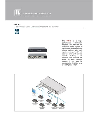 The VM-42 is a compact composite video distribution amplifier and switcher that can distribute one composite video input signal to eight identical outputs. It can be configured as a 1:8 distribution amplifier, a 4x1 vertical interval switcher, or in other configurations such as two 1:4 distribution amplifiers or a 1:6 amplifier plus a 1:2 amplifier. It has a bandwidth of 200MHz and provides high quality distribution with low differential gain, phase, and crosstalk.