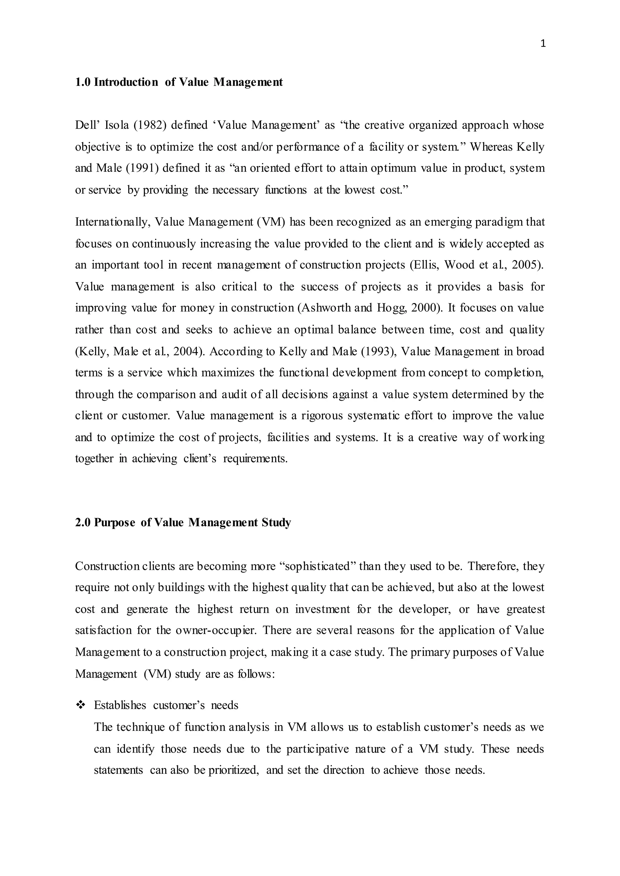 The document provides definitions and background information on value management. It discusses value management as a process that focuses on optimizing value and cost for projects. The document then describes the specific project being analyzed - a 5-story administrative building with data center spaces. It identifies that the project's cost estimate of RM 30 million exceeds the client's budget. Therefore, value management will be applied to optimize the design and cost without negatively impacting functionality or performance. The functional analysis technique is used to analyze the functions of different components and identify potential cost savings through area reductions or function consolidations. The analysis identifies over RM 1.8 million in potential cost savings through various space optimization proposals.
