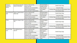 This document summarizes the results of a value management workshop for an educational building project in Klang Valley, Malaysia. The workshop identified ways to reduce costs and improve value. Recommendations included changing from conventional to industrialized building system construction, reducing the number of lifts, combining electrical rooms, and changing to a hollow slab system. These and other changes could save an estimated RM1,127,133.84 and reduce the construction cost from RM4,687,275.92 to RM3,560,142.08. The value management approach was deemed successful and should be implemented earlier in the design process.