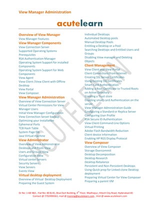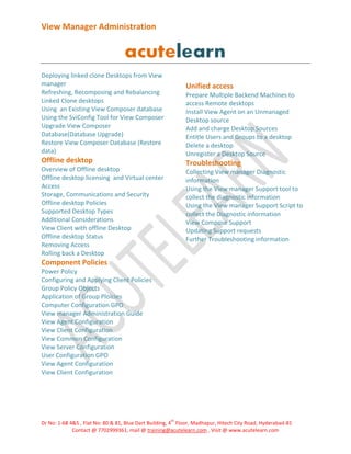 The document is a comprehensive administration guide for View Manager, detailing features such as desktop pools, user and group management, and SSL server certificate creation. It covers topics on configuring servers, deploying linked clone desktops, and troubleshooting both online and offline desktops. Additionally, it provides information on policies, permissions, and the management of virtual desktops and applications.