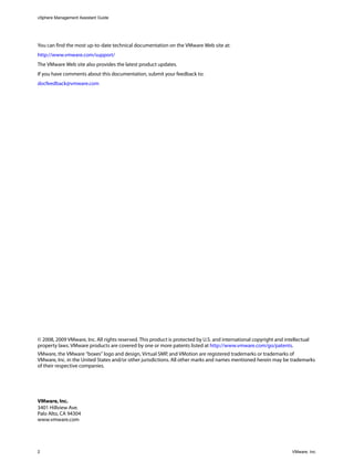 The vSphere Management Assistant (vMA) is a preconfigured Linux virtual machine that allows administrators to remotely manage ESXi and vCenter Server systems through scripts and agents without repeated authentication. It includes tools like the vSphere CLI and SDK for Perl and supports collecting and storing logs from managed systems. vMA can help port existing service console scripts to a centralized platform and supports both single and multiple system targets.