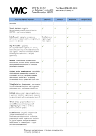 Документ описывает возможности и издания платформы VMware vSphere 4.1, включая информация о лицензировании, доступных функциях и изменениях по сравнению с предыдущими версиями. Важные аспекты включают обязательность поддержки и подписки на обновления, изменения в способах лицензирования и цены на продукты, повысившиеся с 26 июля 2010 года. Также представлены сравнительные таблицы разных изданий и пакетов VMware vSphere 4.1, выделяющие их основные характеристики и ограничения.