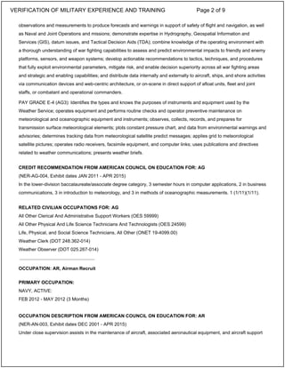 This document provides a summary of an individual's military experience and training as an Aerographer's Mate (AG) in the U.S. Navy from 2012 to 2015. It lists their duties in the AG occupation from 2012 to 2015 including operating meteorological equipment and presenting weather briefs. It also provides descriptions of relevant Navy training courses completed between 2012 and 2013 related to meteorology, oceanography, and environmental support of operations.