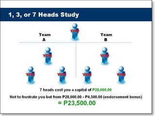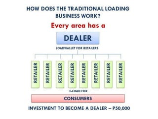 This document provides information about a franchise opportunity selling prepaid loads and cards through Vmobile Technologies Inc. It details the franchise package cost of P3,988 which includes supplies to start the business. Franchisees can earn commissions of 2% for every load consumed through access cards distributed, with potential to earn over P12,000 per month. The multi-level marketing structure is explained where franchisees earn P500 for every new franchise sold in their team, with no limit to earnings. Examples show how one could earn over P1 million within a year if a sales force is built. Instructions for encashing earnings are also provided.