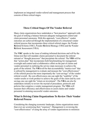 This document discusses strategies for effective vendor management in the claims process. It outlines a three stage process for vendor referrals: 1) Vendor Referral Criteria (VRC) where claims personnel document the rationale for referrals, 2) Vendor Referral Strategy (VRS) which creates an action plan for the referral, and 3) Vendor Referral Assessment (VRA) which evaluates the cost-effectiveness and outcomes of referrals. Implementing this process can help balance oversight with allowing claims personnel autonomy in referrals to improve outcomes and cost savings.