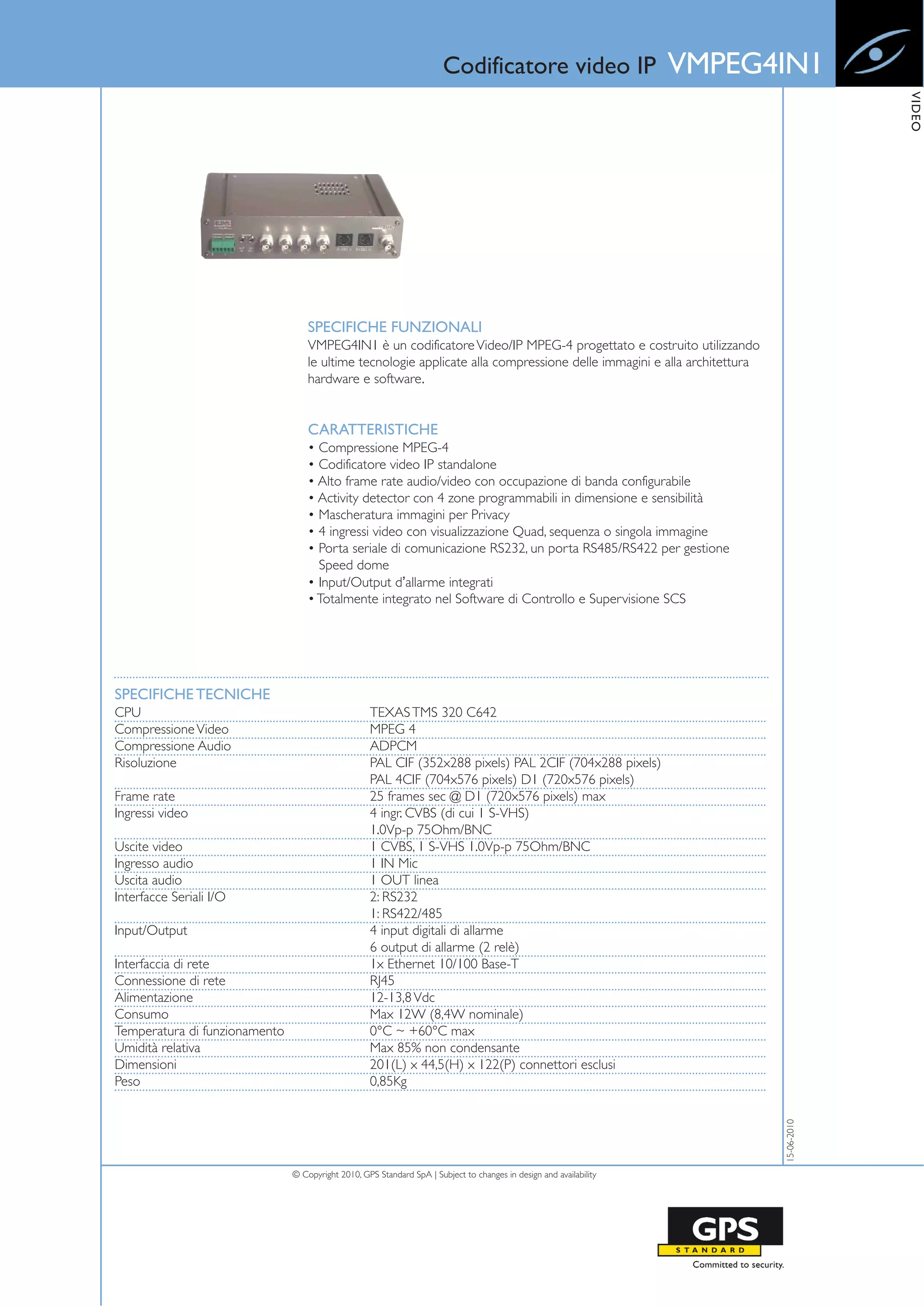 Il documento descrive il codificatore video IP vmpeg4in1, un dispositivo progettato per la compressione video in standard MPEG-4, con funzionalità avanzate come la rilevazione di movimento e mascheratura per la privacy. Supporta fino a quattro ingressi video, diverse risoluzioni e offre varie interfacce di comunicazione, tra cui RS232 e RS485. È compatibile con reti Ethernet e ha specifiche tecniche dettagliate per prestazioni e condizioni operative.