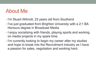 Stuart Wilmott is a 23-year-old recent university graduate seeking a career in recruitment. He has experience in sales, negotiations, and customer service from previous roles at banks. Stuart is motivated by the fast pace and high earnings potential of recruitment. He believes his communication skills, ambition, and ability to learn quickly would allow him to succeed from a trainee role to senior management within 5 years. Stuart understands VMR Consultants' focus on finding the right candidates and supporting long term growth. He aims to contribute positively and prove his worth through hard work and dedication.