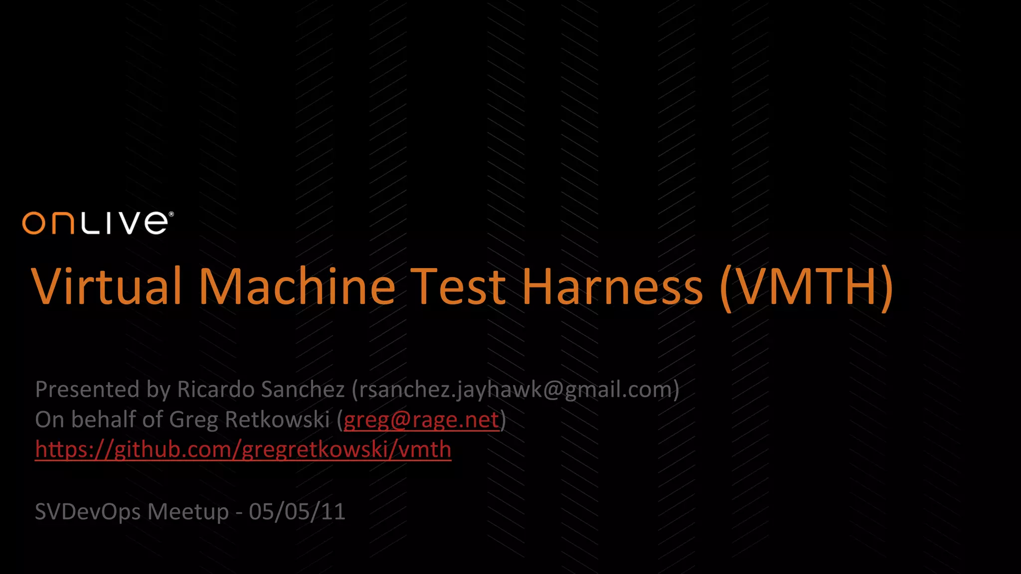 The Virtual Machine Test Harness (VMTH) is an automation tool that runs unit tests against a virtual machine running a live system image. It integrates with continuous integration servers to trigger tests after every code commit. The tool uses VM snapshotting to quickly run through test cases. It was created to help test configuration management like Puppet in a safe, isolated way compared to testing in production. The document outlines the VMTH workflow using Puppet as an example, describes the tools used like the virb interactive browsing tool, and provides resources for more information.