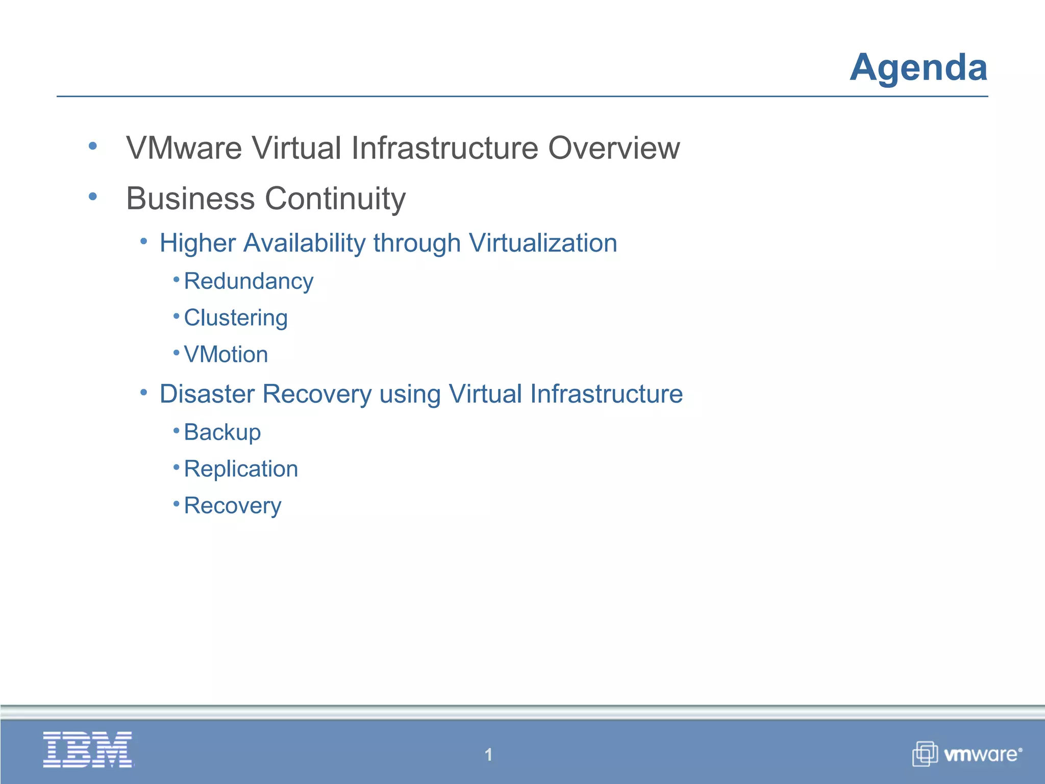 The document discusses business continuity strategies using VMware virtual infrastructure. It covers high availability through redundancy, clustering, and VMotion to reduce planned and unplanned downtime. It also discusses disaster recovery using backup, replication, and recovery capabilities enabled by virtual infrastructure.