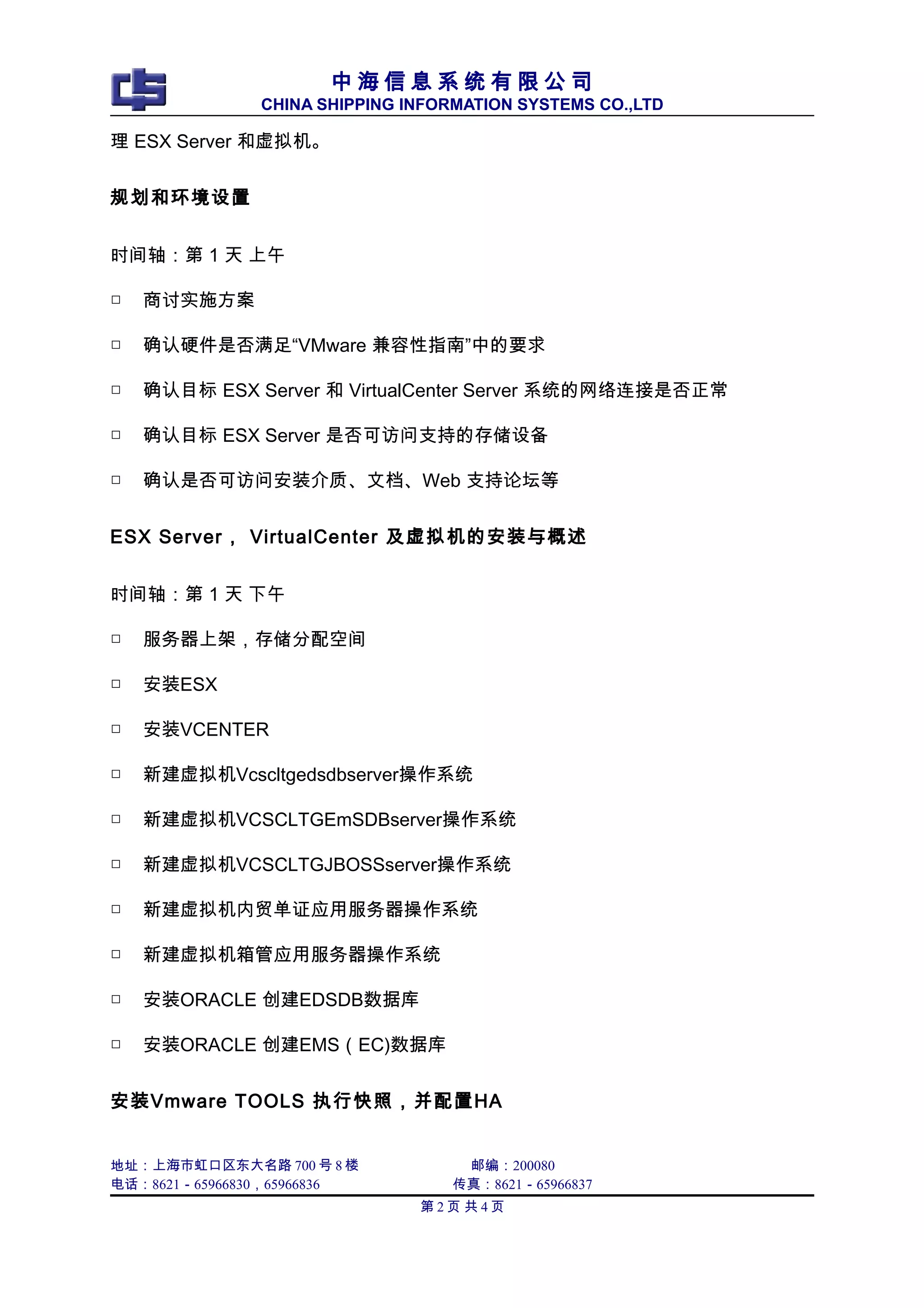 该文档总结了天津集运 VMware 项目的实施过程,包括环境设置、服务器安装和虚拟机配置的详细时间轴。主要步骤涵盖了虚拟化技术的应用,确保IT基础架构的有效转变。文档提供了实施中的具体任务安排和测试计划。