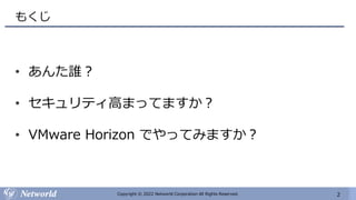 VMUG 2022/03/25 でスピーカーをしたときの資料です。 セッションタイトルは「セキュリティ意識が高いひと向けの話」でした。 VMware Horizon 単体では FIDO2 準拠のセキュリティキーである YubiKey による認証はできないので、Workspace ONE Access 経由で認証をします。