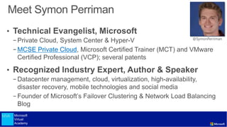 This document discusses Microsoft Virtual Academy (MVA) which provides free online training for IT professionals on Microsoft products. It promotes an upcoming MVA event that will provide training on Windows Server 2012 Hyper-V, System Center 2012, and VMware's Private Cloud. The event will compare Hyper-V and VMware virtualization platforms and discuss storage, security, high availability, and private/hybrid clouds. It also provides details on performance and scalability improvements in Windows Server 2012 Hyper-V over previous versions and how it compares to VMware vSphere 5.1.