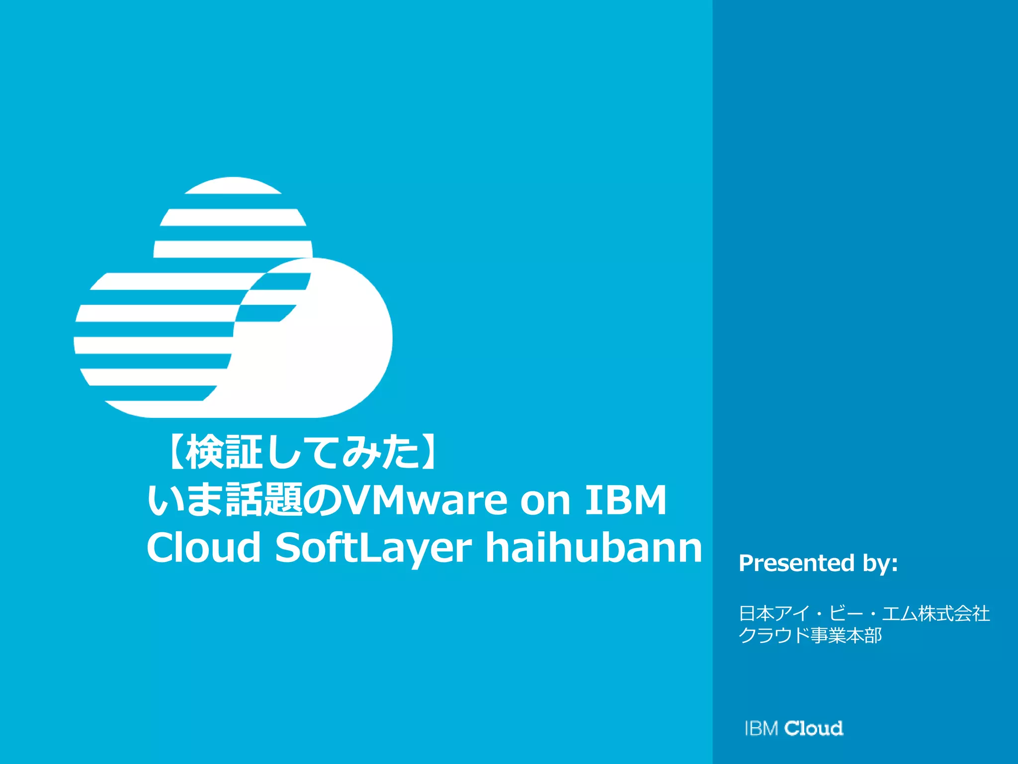 Open Cloud Innovation Festa 2016 【検証してみた】いま話題のVMware on IBM Cloud SoftLayer 日本IBM ・クラウド・テクニカル・サービス 葉山 慶平 ・クラウド・テクニカル・サービス 多田 勇樹 http://softlayer.connpass.com/event/34524/
