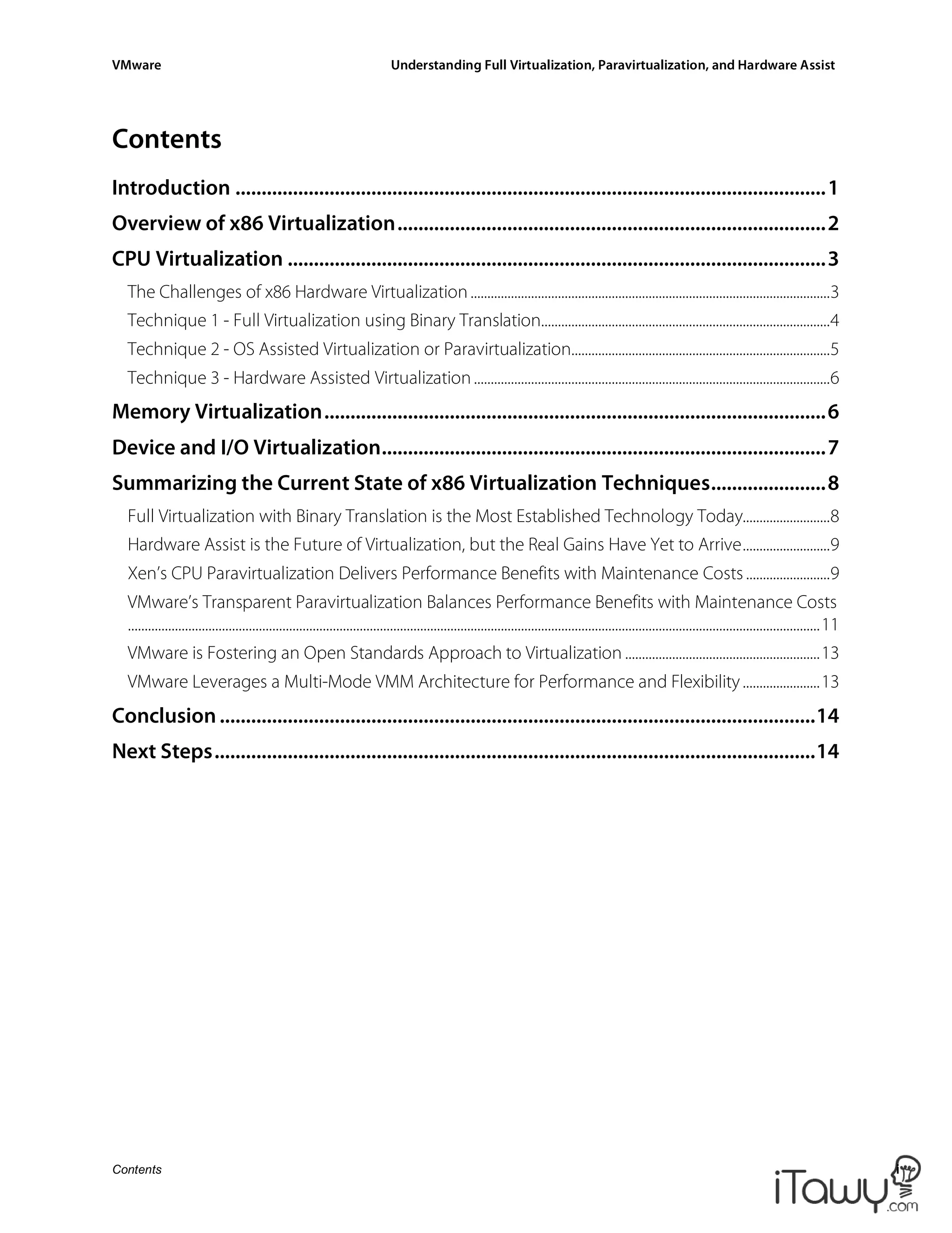 3) The document compares the techniques and notes that VMware uses all three, balancing performance and functionality for different workloads and hardware.