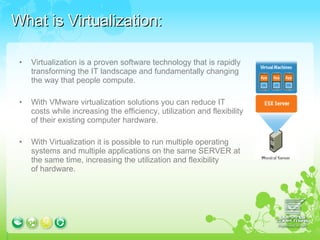 Virtualization allows multiple operating systems and applications to run on the same physical server at the same time. This increases hardware utilization and flexibility while reducing IT costs. VMware virtualization solutions can reduce energy costs by 80% through server consolidation and powering down unused servers without affecting applications or users. Virtualization makes hardware resources independent of operating systems and applications, treating them as single unified units that can be more easily deployed, maintained, and supported.
